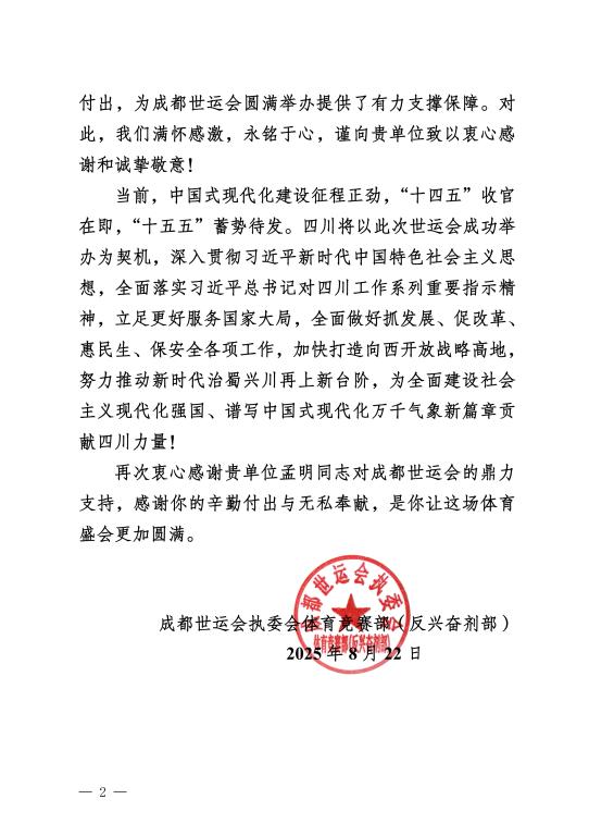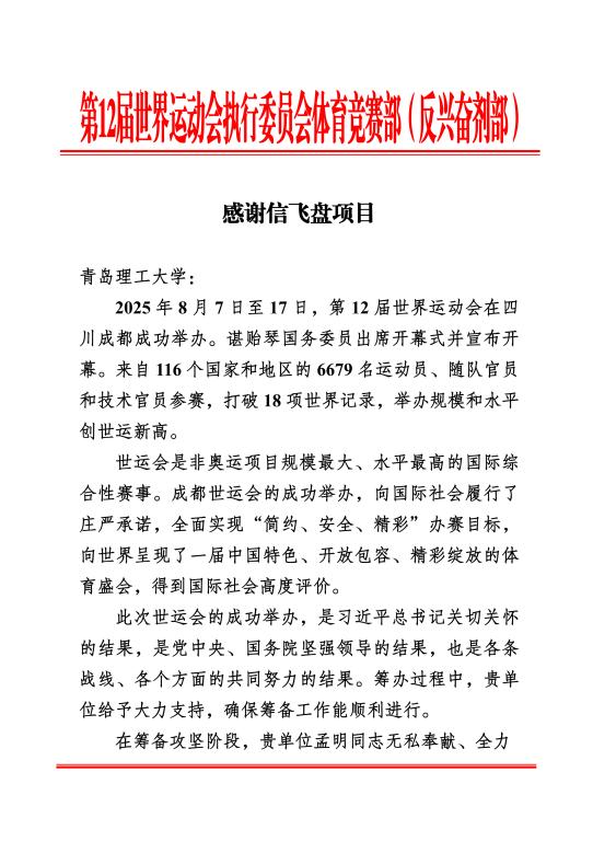 第12届世界运动会执行委员会体育竞赛部(反兴奋剂部)——感谢信飞盘项目